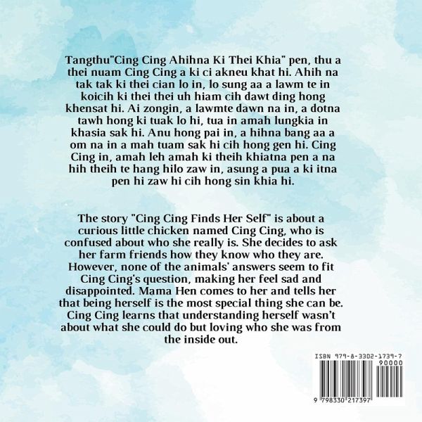 The story "Cing Cing Finds Her Self" is about a curious little chicken named Cing Cing, who is confused about who she really is. She decides to ask her farm friends how they know who they are. However, none of the animals' answers seem to fit Cing Cing's question, making her feel sad and disappointed. Mama Hen comes to her and tells her that being herself is the most special thing she can be. Cing Cing learns that understanding herself wasn't about what she could do but loving who she was from the inside out.