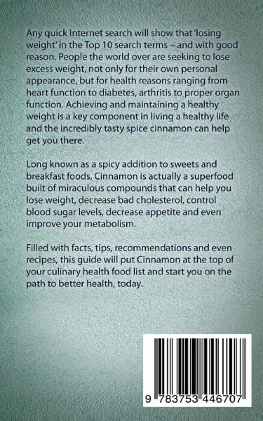Any quick Internet search will show that 'losing weight' in the Top 10 search terms - and with good reason. People the world over are seeking to lose excess weight, not only for their own personal appearance, but for health reasons ranging from heart function to diabetes, arthritis to proper organ function. Achieving and maintaining a healthy weight is a key component in living a healthy life and the incredibly tasty spice cinnamon can help get you there.Long known as a spicy addition to sweets and breakfast foods, Cinnamon is actually a superfood built of miraculous compounds that can help you lose weight, decrease bad cholesterol, control blood sugar levels, decrease appetite and even improve your metabolism.Filled with facts, tips, recommendations and even recipes, this guide will put Cinnamon at the top of your culinary health food list and start you on the path to better health, today.