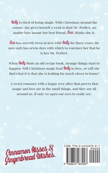 Holly is tired of being single. With Christmas around the corner, she gives herself a week to find Mr Perfect, no matter how insane her best friend, Finn, thinks she is. Finn has secretly been in love with Holly for three years. He now only has seven days with which to convince her that he is her Mr Perfect. When Holly finds an old recipe book, strange things start to happen. Will Christmas magic lead Holly to love, or will she find what it is that she is looking for much closer to home? A sweet romance with a happy ever after that proves that magic and love are in the small things, and they are all around us, if only we open our eyes to really see.