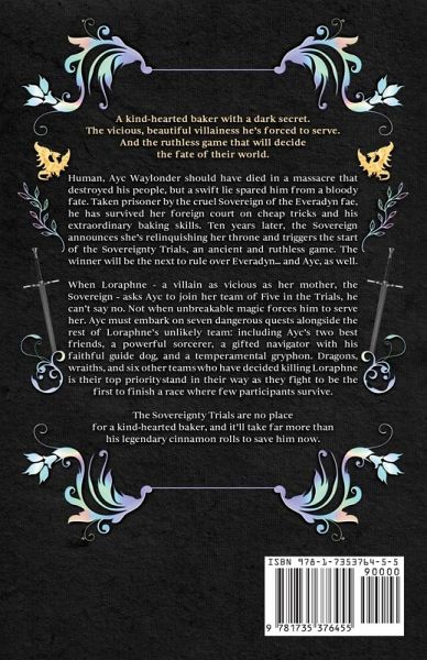 A kind-hearted baker with a dark secret. The vicious, beautiful villainess he's forced to serve. And the ruthless game that will decide the fate of their world. Human, Ayc Waylonder should have died in a massacre that destroyed his people, but a swift lie spared him from a bloody fate. Taken prisoner by the cruel Sovereign of the Everadyn fae, he has survived her foreign court on cheap tricks and his extraordinary baking skills. Ten years later, the Sovereign announces she's relinquishing her throne and triggers the start of the Sovereignty Trials, an ancient and ruthless game. The winner will be the next to rule over Everadyn... and Ayc, as well. When Loraphne - a villain as vicious as her mother, the Sovereign - asks Ayc to join her team of Five in the Trials, he can't say no. Not when unbreakable magic forces him to serve her. Ayc must embark on seven dangerous quests alongside the rest of Loraphne's unlikely including Ayc's two best friends, a powerful sorcerer, a gifted navigator with his faithful guide dog, and a temperamental gryphon. Dragons, wraiths, and six other teams-who have decided killing Loraphne is their top priority-stand in their way as they fight to be the first to finish a race where few participants survive. The Sovereignty Trials are no place for a kind-hearted baker, and it'll take far more than his legendary cinnamon rolls to save him now. Cinnamon Rolls and Villainy is Book 1 in a high stakes, adult romantic fantasy series, with enemies to lovers, spicy romance, and a cinnamon roll hero who will lay claim to your heart and refuse to let go. Perfect for adult fans of The Cruel Prince.