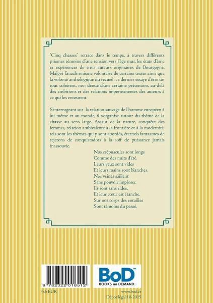 "Cinq Chasses" regroupe les oeuvres de trois jeunes auteurs originaires de Bourgogne.Bien que la plupart des textes s'inscrivent dans le champ de la poésie, certains écrits s'apparentent plus à des réflexions inspirées par des choses somme toute assez simple : une vision à travers la vitre d'un train, un souvenir d'une nuit avec une femme, une expérience opiacée.Le recueil s'articule ainsi :* Sylves !* Femmes ?* Frontière.* Mystique...* InadaptationExtrait : (par Hugues Roumier)Ils sont insectes et tas d'épingles,Thermites et bacchanales.Nous sommes faucons,Taupes et sorciers.Leurs jours sont junglesEt fracas du métal,Nos crépuscules sont longsComme des nuits d'été.Leurs yeux sont videsEt leurs mains sont blanches.Nos veines saillentSans pouvoir imploser.Ils sont sans rides,Et leur coeur est étanche.Sur nos corps des entaillesSont témoins du passé.