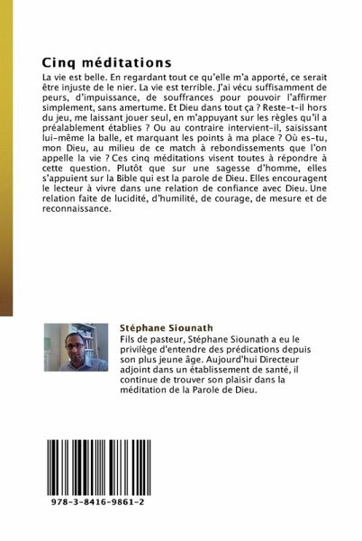 La vie est belle. En regardant tout ce qu elle m a apporté, ce serait être injuste de le nier. La vie est terrible. J ai vécu suffisamment de peurs, d impuissance, de souffrances pour pouvoir l affirmer simplement, sans amertume. Et Dieu dans tout ça ? Reste-t-il hors du jeu, me laissant jouer seul, en m appuyant sur les règles qu il a préalablement établies ? Ou au contraire intervient-il, saisissant lui-même la balle, et marquant les points à ma place ? Où es-tu, mon Dieu, au milieu de ce match à rebondissements que l on appelle la vie ? Ces cinq méditations visent toutes à répondre à cette question. Plutôt que sur une sagesse d homme, elles s appuient sur la Bible qui est la parole de Dieu. Elles encouragent le lecteur à vivre dans une relation de confiance avec Dieu. Une relation faite de lucidité, d humilité, de courage, de mesure et de reconnaissance.