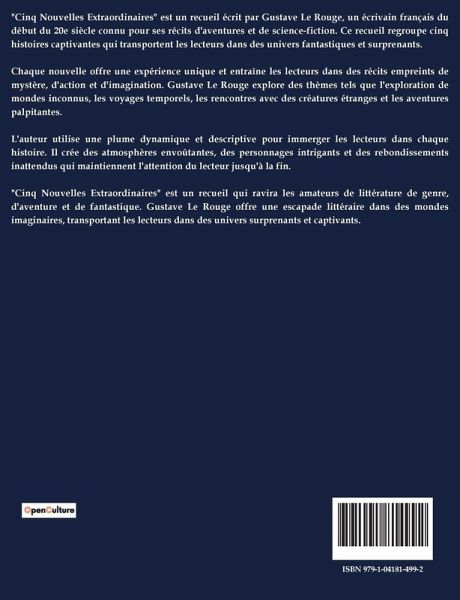 "Cinq Nouvelles Extraordinaires" est un recueil écrit par Gustave Le Rouge, un écrivain français du début du 20e siècle connu pour ses récits d'aventures et de science-fiction. Ce recueil regroupe cinq histoires captivantes qui transportent les lecteurs dans des univers fantastiques et surprenants. Chaque nouvelle offre une expérience unique et entraîne les lecteurs dans des récits empreints de mystère, d'action et d'imagination. Gustave Le Rouge explore des thèmes tels que l'exploration de mondes inconnus, les voyages temporels, les rencontres avec des créatures étranges et les aventures palpitantes. L'auteur utilise une plume dynamique et descriptive pour immerger les lecteurs dans chaque histoire. Il crée des atmosphères envoûtantes, des personnages intrigants et des rebondissements inattendus qui maintiennent l'attention du lecteur jusqu'à la fin. "Cinq Nouvelles Extraordinaires" est un recueil qui ravira les amateurs de littérature de genre, d'aventure et de fantastique. Gustave Le Rouge offre une escapade littéraire dans des mondes imaginaires, transportant les lecteurs dans des univers surprenants et captivants.