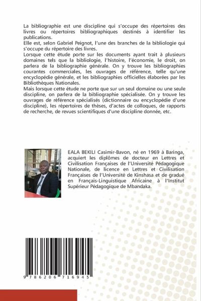 La bibliographie est une discipline qui s'occupe des répertoires des livres ou répertoires bibliographiques destinés à identifier les publications.Elle est, selon Gabriel Peignot, l'une des branches de la bibliologie qui s'occupe du répertoire des livres.Lorsque cette étude porte sur les documents ayant trait à plusieurs domaines tels que la bibliologie, l'histoire, l'économie, le droit, on parlera de la bibliographie générale. On y trouve les bibliographies courantes commerciales, les ouvrages de référence, telle qu'une encyclopédie générale, et les bibliographies officielles élaborées par les Bibliothèques Nationales.Mais lorsque cette étude ne porte que sur un seul domaine ou une seule discipline, on parlera de la bibliographie spécialisée. On y trouve les ouvrages de référence spécialisés (dictionnaire ou encyclopédie d'une discipline), les répertoires de thèses, d'actes de colloques, de rapports de recherche, de revues scientifiques d'une discipline donnée, etc.