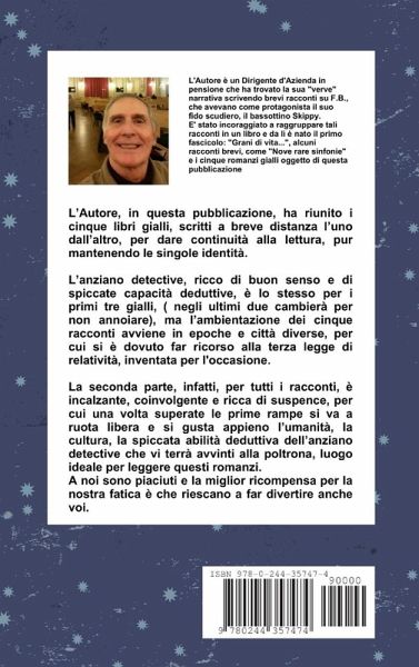 L'Autore, in questa pubblicazione, ha riunito i cinque libri gialli, scritti a breve distanza l'uno dall'altro, per dare continuità alla lettura, pur mantenendo le singole identità. L'anziano detective, ricco di buon senso e di spiccate capacità deduttive, è lo stesso per i primi tre gialli, ( negli ultimi due cambierà per non annoiare), ma l'ambientazione dei cinque racconti avviene in epoche diverse, per cui si è dovuto far ricorso alla terza legge di relatività, creata apposta per questo caso. La seconda parte infatti, per tutti i racconti, è incalzante, coinvolgente e ricca di suspence, per cui una volta superate le prime rampe si va a ruota libera e si gusta appieno l'umanità, la cultura, la spiccata abilità deduttiva dell'anziano detective che vi terrà avvinti alla poltrona, luogo ideale per leggere questi romanzi. A noi sono piaciuti e la miglior ricompensa per la nostra fatica è che riescano a far divertire anche voi.
