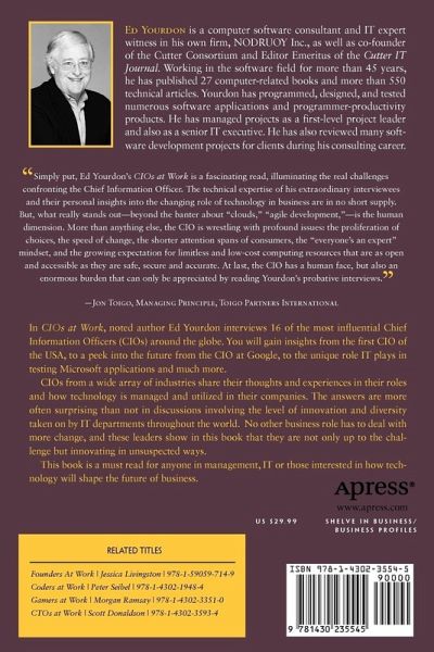 "Simply put, Ed Yourdon's CIOs at Work is a fascinating read. The author has managed to illuminate the real challenges confronting the Chief Information Officer. The technical expertise of his extraordinary interviewees and their personal insights into the changing role of technology in business are in no short supply. But, what really stands out- beyond the banter about "clouds," "agile development,"-is the human dimension. More than anything else, the CIO is wrestling with profound issues: the proliferation of choices, the speed of change, the shorter attention spans of consumers, the "everyone's an expert" mindset, and the growing expectation for limitless and low cost computing resources that are as open and accessible as they are safe, secure and accurate. At last, the CIO has a human face, but also an enormous burden that can only be appreciated by reading Yourdon's probative interviews." -Jon Toigo, Managing Principle, Toigo Partners International