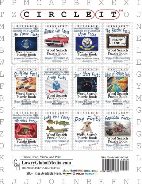 What was your favorite toy when you were a kid? "Circle It" word search books read like a book and are full of interesting facts, the bold words within the text can be found in the word search puzzle on the opposite page. UPGRADE your word search and be the one everyone wants to talk with; your friends will wonder, how did you get so smart? Everyone will really enjoy your conversation when you say, "The other day I was reading and did you know that...." Typical word searches are just dull lists of words, "Circle It" word search books read like a book and are full of interesting facts. Each "Circle It" word search book has an interesting subject, like: * Muscle Car Facts * Quilting Facts * Lake Fish Facts * Dog Facts * Cat Facts * Hockey Facts * ...many many more (200+ titles) Lowry Global Media, Circle It Word Search Books are all available from your favorite online bookseller. Just search for "Lowry Global Media" to see all of our word search titles. Looking for a gift? Our books are great for anyone ages 12 to 99. TABLE OF CONTENTS: Introduction - 1 Facts and Puzzles Army Men - 2 Barrel of Monkeys - 10 Chatter Telephone - 20 Chatty Cathy - 24 Creepy Crawlers - 34 Don't Break the Ice - 48 Easy-Bake Oven - 48 Etch A Sketch - 58 G.I. Joe - 68 Gonk - 108 Johnny West - 110 Ken - 112 Love Tester - 118 Solutions - Back of the book References - Further in the back of the book (hey, it's a puzzle book not a novel) ------------------------------------------- In Book 2 (Yes, there are two books full of 1960s Toys) this is the Table of Contents. From 1960s Toys Book 2 (ISBN 978-1-945512-77-3)...get yours today. Facts and Puzzles Love Tester - 118 Metal House Robots - 122 Motorific - 126 Nerf - 134 Operation - 150 Rock 'Em Sock 'Em Robots - 156 See 'n Say - 164 Slinky - 170 Slip 'N Slide - 186 Suzy Homemaker - 188 Tammy - 192 Tracer Gun - 196 Troll Doll - 200 Twister - 206 Wizzzer - 226