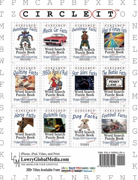 What's your favorite Clint Eastwood quote? "Go ahead punk, make my day". Are you a Rawhide fan, or a Dirty Harry fan? "Circle It" word search books read like a book and are full of interesting facts, the bold words within the text can be found in the word search puzzle on the opposite page. UPGRADE your word search and be the one everyone wants to talk with; your friends will wonder, how did you get so smart? Everyone will really enjoy your conversation when you say, "The other day I was reading and did you know that...." Typical word searches are just dull lists of words, "Circle It" word search books read like a book and are full of interesting facts. Each "Circle It" word search book has an interesting subject, like: * Muscle Car Facts * Quilting Facts * Lake Fish Facts * Dog Facts * Cat Facts * Hockey Facts * ...many many more (200+ titles) Lowry Global Media, Circle It Word Search Books are all available from your favorite online bookseller. Just search for "Lowry Global Media" to see all of our word search titles. Looking for a gift? Our books are great for anyone ages 12 to 99.