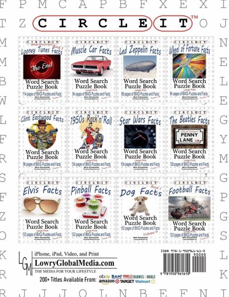Some of my favorite sketches were: PFFT! You Was Gone!, KORN News, and Pickn' and Grinnin'. Find our why Slim Pickens was only in the first two seasons; page 18. Find out what year Buck Owens got his first number on song in; page 80. Did you know Roy Clark was also an airplane pilot, read all about it on page 92. "Circle It" word search books read like a book and are full of interesting facts, the bold words within the text can be found in the word search puzzle on the opposite page. UPGRADE your word search and be the one everyone wants to talk with; your friends will wonder, how did you get so smart? Everyone will really enjoy your conversation when you say, "The other day I was reading and did you know that...." Typical word searches are just dull lists of words, "Circle It" word search books read like a book and are full of interesting facts. Each "Circle It" word search book has an interesting subject, like: * Muscle Car Facts * Quilting Facts * Lake Fish Facts * Dog Facts * Cat Facts * Hockey Facts * ...many many more (200+ titles) Lowry Global Media, Circle It Word Search Books are all available from your favorite online bookseller. Just search for "Lowry Global Media" to see all of our word search titles. Looking for a gift? Our books are great for anyone ages 12 to 99.