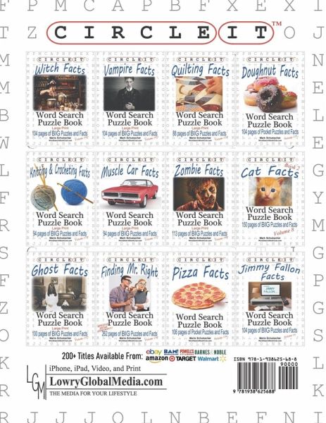 If you know what bat tail and eye of newt is, then your just found the right book!!! You already really like word searches, but most books are virtually the same with just lists of words. There must be something more, and now there is; in our books you can read interesting facts, the bold words within the text can be found in the puzzle on the opposite page. No more boring lists of words(TM). This book contains interesting facts about Witches. It reads like a book and it also has page after page of word search puzzles. Why just work through lists of words when you can discover interesting facts about Witches and enjoy some stimulating Circle It word search. No more boring lists of words(TM). The words for the Circle It word search are in bold within the text. All of the Facts series of Circle It word search books contain a wide variety of community contributed information that is useful, interesting, and fun. Get yours today. ------------------------------------------------------------------------ Each "Circle It" word search book has an interesting subject, like: * Vampire Facts * Zombie Facts * Ghost Facts * World War II Facts * Jimmy Fallon Facts * Chocolate Facts * ...many many more (180+ titles) Lowry Global Media, Circle It Word Search Books are all available from your favorite online bookseller. Just search for "Lowry Global Media" to see all of our word search titles. Looking for a gift? Our books are great for anyone ages 12 to 99. Contents Introduction - 1 Facts and Puzzles Witch Germanic Etymology - 2 From Old to Modern English - 4 Hag In Folklore - 6 Wicca - 12 Witchcraft and Wicca - 16 Beliefs - 20 Practices - 38 Traditions - 54 History - 58 Witchcraft - 70 Alleged Practices - 76 Contemporary Witchcraft - 90 Historical and Religious Perspectives - 102 By Region - 114