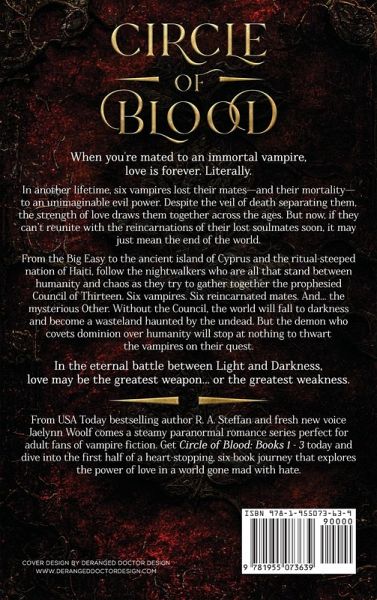 When you're mated to an immortal vampire, love is forever. Literally. In another lifetime, six vampires lost their mates-and their mortality-to an unimaginable evil power. Despite the veil of death separating them, the strength of love draws them together across the ages. But now, if they can't reunite with the reincarnations of their lost soulmates soon, it may just mean the end of the world. From the Big Easy to the ancient island of Cyprus and the ritual-steeped nation of Haiti, follow the nightwalkers who are all that stand between humanity and chaos as they try to gather together the prophesied Council of Thirteen. Six vampires. Six reincarnated mates. And... the mysterious Other. Without the Council, the world will fall to darkness and become a wasteland haunted by the undead. But the demon who covets dominion over humanity will stop at nothing to thwart the vampires on their quest. In the eternal battle between Light and Darkness, love may be the greatest weapon... or the greatest weakness. * * * From USA Today bestselling author R. A. Steffan and fresh new voice Jaelynn Woolf comes a steamy paranormal romance series perfect for adult fans of vampire fiction. Get Circle of Blood: Books 1 - 3 today and dive into the first half of a heart-stopping, six-book journey that explores the power of love in a world gone mad with hate.