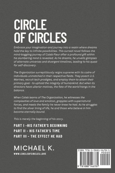 Embrace your imagination and journey into a realm where dreams hold the key to infinite possibilities. This surreal novel follows the mind-boggling journey of Caleb Fleur after a profound gift within his slumbering mind is revealed. As he dreams, he unveils glimpses of alternate universes and divergent timelines, leading to his quest for self-discovery. The Organization surreptitiously reigns supreme with its cadre of individuals unmatched in their respective fields. They poach U.S. Marines, recruit tech prodigies, and employ them to attain their primary goal - to uphold the integrity of mankind. But when its directors have ulterior motives, the fate of the world hangs in the balance. When Caleb learns of The Organization, he witnesses the complexities of love and emotion, grapples with supernatural forces, and meets the family he never knew he had. As he struggles to find the silver lining in life, he and those who believe in him become eternally bound. This is merely the beginning of his story. www.circleofcircles.love www.officialmichaelk.com