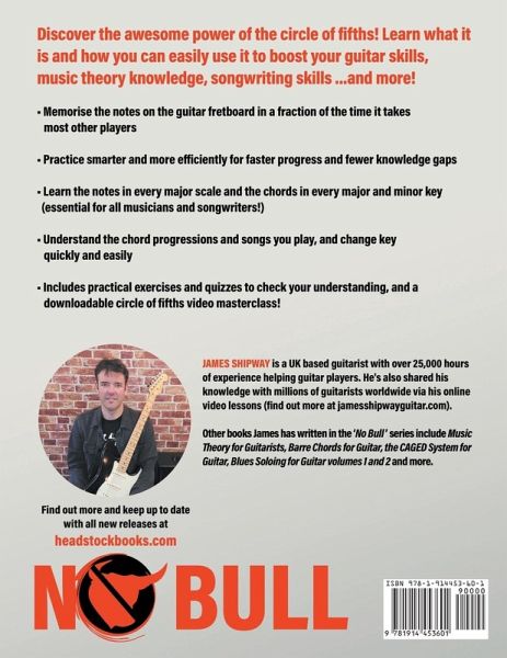Boost your guitar fretboard and guitar theory skills, your memorization and recall of the notes on your guitar neck, your music theory for guitar understanding, your knowledge of chords and chord theory, your songwriting and composition skills... and much more with the awesome power of the circle of fifths! Many guitar players never have the circle of fifths explained to them in a way that makes sense, so they never learn to use this amazing, visual tool for musicians. If you want the circle of fifths made easy, without the confusion you experience with most guitar theory books, then this title, with its accompanying 45 minute downloadable Circle of Fifths Video Masterclass and bonus resources is exactly what you need. In this book, I show you straightforward secrets or 'recipes' for using the circle of fifths chord wheel to: Learn your guitar fretboard and painlessly memorize all the notes on your guitar neck so that you never forget them (using a single easy chord shape!) Create guitar exercises for memorizing chord shapes, scale patterns, arpeggios, and licks, so that you can practice smarter and more efficiently than ever before and see greater progress Learn all the notes in every major scale and all the chords in every major and minor key so that you understand chord theory and chord progressions on a whole new level (essential knowledge for all musicians and songwriters) Understand, memorize and learn the songs you play more easily than ever before, and change key quickly and easily when you need to Work out the chords for a 12 bar blues or I-IV-V chord sequence in any key instantly using a simple 'one forward, one back' pattern Work out and memorize relative minors, I-VI-II-V, II-V-I, III-VI-II-V-I chord progressions, major scale 'tricks' and shortcuts, and more With bite-sized lessons revealing crucial circle of fifths secrets, practical exercises, and quizzes to check your understanding, plus downloadable bonus content including a video masterclass, any guitar player can master what they need to know about the circle of fifths with this book.