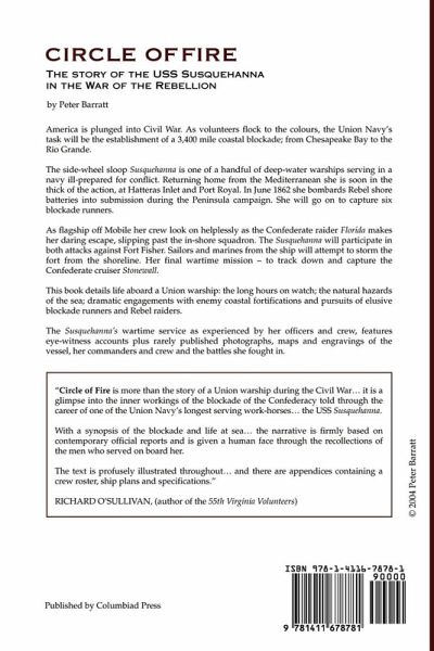 Circle of Fire tells the story of the Union side-wheel sloop of war Susquehanna in the War of the Rebellion. From chasing elusive Confederate blockade runners and commerce raiders to bombarding Rebel shore fortifications - the Susquehanna's tale is based on contemporary records backed up with rarely published photos, maps and engravings of the vessel, her commanders and crew and the battles she fought in. Following her return from duty with the Mediterranean squadron she is soon in the thick of the action at Hatteras Inlet and Port Royal. Circle of Fire is more than the story of a Union warship in the Civil War. it is a glimpse into the inner workings of the blockade of the Confederacy as seen through the career of one of the Union navy's longest serving warhorses. the USS Susquehanna. The text is profusely illustrated throughout and there are appendices containing a crew roster, ship plans and specifications.