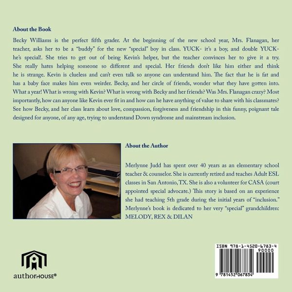 Becky Williams is the perfect fifth grader. At the beginning of the new school year, Mrs. Flanagan, her teacher, asks her to be a "buddy" for the new "special" boy in class. YUCK- it's a boy, and double YUCK- he's special!. She tries to get out of being Kevin's helper, but the teacher convinces her to give it a try. She really hates helping someone so different and special. Her friends don't like him either and think he is strange. Kevin is clueless and can't even talk so anyone can understand him. The fact that he is fat and has a baby face makes him even weirder. Becky, and her circle of friends, wonder what they have gotten into. What a year! What is wrong with Kevin? What is wrong with Becky and her friends? Was Mrs. Flanagan crazy? Most importantly, how can anyone like Kevin ever fit in and how can he have anything of value to share with his classmates? See how Becky, and her class learn about love, compassion, forgiveness and friendship in this funny, poignant tale designed for anyone, of any age, trying to understand Down syndrome and mainstream inclusion.