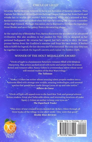 Attorney Sarina Bretton is kidnapped from Earth to become the legendary Great Healer and save the galaxy in this award-winning science fiction romance. Attorney Sarina Bretton believes in facts, not fantasies of faraway planets. Then Captain Teir Reylock of the Coalition Defense League kidnaps her from Earth and whisks her to worlds she couldn't have imagined. While she's stunned at first, Sarina is even more astonished when Teir says he's taking her to marry a member of the High Council. Through this union, she is destined to become the legendary Great Healer and save the galaxy from a devastating plague. At the capital city of Bimordus Two, Sarina discovers the wonders of an advanced civilization. She also awakens to her passion for Teir, who is assigned as her personal bodyguard. He returns her regard, but he's sworn to duty. He must protect Sarina from the Coalition's enemies and from his own desire. If Sarina fails to fulfill the legend, the law decrees she'll be executed. The only way they can be together is to unlock the legend's secrets and expose the hidden truth. Winner of the HOLT Medallion Award "Nancy Cohen sparks your imagination and melts your heart with her wonderful tale of galactic adventure and star-crossed lovers." Marilyn Campbell, award-winning author of The Innerworld Affairs series "This story dazzled me. In fact, I blew through all three books of the trilogy in one short week-they were that good!" Muddy Rose Reviews