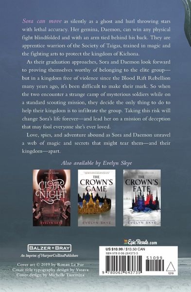 A thrilling new fantasy series full of magic and betrayal?from Evelyn Skye, New York Times bestselling author of the Crown's Game series. Sora can move as silently as a ghost and hurl throwing stars with lethal accuracy. Her gemina, Daemon, can win any physical fight blindfolded and with an arm tied around his back. They are apprentice warriors of the Society of Taigas?marked by the gods to be trained in magic and the fighting arts to protect the kingdom of Kichona. As their graduation approaches, Sora and Daemon look forward to proving themselves worthy of belonging in the elite group?but in a kingdom free of violence since the Blood Rift Rebellion many years ago, it's been difficult to make their mark. So when Sora and Daemon encounter a strange camp of mysterious soldiers while on a standard scouting mission, they decide the only thing to do to help their kingdom is to infiltrate the group. Taking this risk will change Sora's life forever?and lead her on a mission of deception that may fool everyone she's ever loved. Love, spies, and adventure abound as Sora and Daemon unravel a complex web of magic and secrets that might tear them?and the entire kingdom?apart forever.