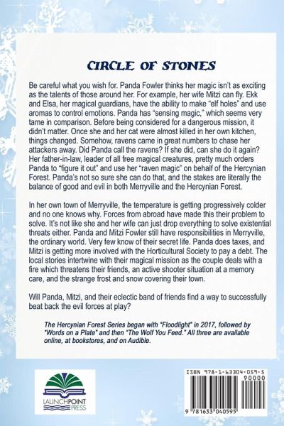 Be careful what you wish for. Panda Fowler thinks her magic isn't as exciting as the talents of those around her. For example, her wife Mitzi can fly. Ekk and Elsa, her magical guardians, have the ability to make "elf holes" and use aromas to control emotions. Panda has "sensing magic," which seems very tame in comparison. Before being considered for a dangerous mission, it didn't matter. Once she and her cat were almost killed in her own kitchen, things changed. Somehow, ravens came in great numbers to chase her attackers away. Did Panda call the ravens? If she did, can she do it again? Her father-in-law, leader of all free magical creatures, pretty much orders Panda to "figure it out" and use her "raven magic" on behalf of the Hercynian Forest. Panda's not so sure she can do that, and the stakes are literally the balance of good and evil in both Merryville and the Hercynian Forest. In her own town of Merryville, the temperature is getting progressively colder and no one knows why. Forces from abroad have made this their problem to solve. It's not like she and her wife can just drop everything to solve existential threats either. Panda and Mitzi Fowler still have responsibilities in Merryville, the ordinary world. Very few know of their secret life. Panda does taxes, and Mitzi is getting more involved with the Horticultural Society to pay a debt. The local stories intertwine with their magical mission as the couple deals with a fire which threatens their friends, an active shooter situation at a memory care, and the strange frost and snow covering their town. Will Panda, Mitzi, and their eclectic band of friends find a way to successfully beat back the evil forces at play?