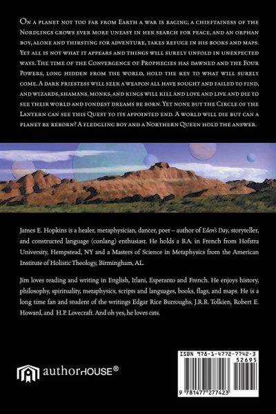 "On a planet not too far from earth a war is raging, a chieftainess of the Nordlings grows ever more uneasy in her search for peace, and an orphan boy, alone and thirsting for adventure, takes refuge in his books and maps. Yet all is not what it appears and things will surely unfold in unexpected ways. The time of the Convergence of Prophecies has dawned and the Four Powers, long hidden from the world, hold the key to what will surely come. A dark priestess will seek a weapon all have sought and failed to find, and wizards, shamans, monks, and kings will kill and love and live and die to see their world and fondest dreams be born. Yet none but the Circle of the Lantern can see this Quest to its appointed end. A world will die but can a planet be reborn. A fledgeling boy and a Northern Queen hold the answer.