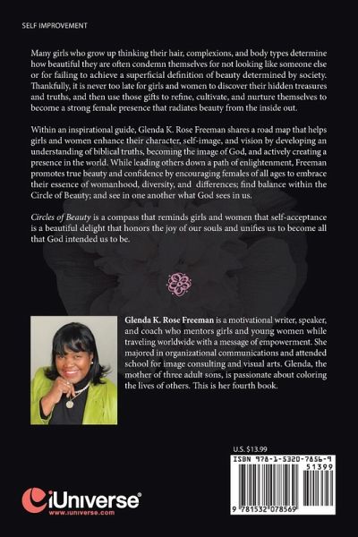 Many girls who grow up thinking their hair, complexions, and body types determine how beautiful they are often condemn themselves for not looking like someone else or for failing to achieve a superficial definition of beauty determined by society. Thankfully, it is never too late for girls and women to discover their hidden treasures and truths, and then use those gifts to refine, cultivate, and nurture themselves to become a strong female presence that radiates beauty from the inside out. Within an inspirational guide, Glenda K. Rose Freeman shares a road map that helps girls and women enhance their character, self-image, and vision by developing an understanding of biblical truths, becoming the image of God, and actively creating a presence in the world. While leading others down a path of enlightenment, Freeman promotes true beauty and confidence by encouraging females of all ages to embrace their essence of womanhood, diversity, and differences; find balance within the Circle of Beauty; and see in one another what God sees in us. Circles of Beauty is a compass that reminds girls and women that self-acceptance is a beautiful delight that honors the joy of our souls and unifies us to become all that God intended us to be.