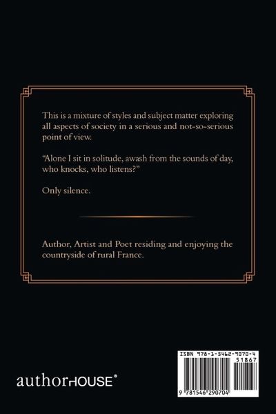 This is a mixture of styles and subject matter exploring all aspects of society in a serious and not-so-serious point of view. Alone I sit in solitude, awash from the sounds of day, who knocks, who listens? Only silence.