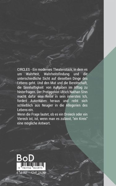 CIRCLES - Ein modernes Theaterstück, in dem es um Wahrheit, Wahrheitsfindung und die unterschiedliche Sicht auf dieselben Dinge des Lebens geht. Und den Mut und die Bereitschaft, die Sinnhaftigkeit von Aufgaben im Alltag zu hinterfragen. Der Protagonist Ulrich Nathan SInn macht dafür eine Reise in sein innerstes Ich, fordert Autoritäten heraus und reiht sich schließlich aus Neugier in die Allegorien des Lebens ein. Wenn die Frage lautet, ob es ein Dreieck oder ein Viereck ist, ist, wenn man es zulässt, "ein Kreis" eine mögliche Antwort.