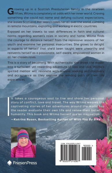 Growing up in a Scottish Presbyterian family in the nineteen fifties, Wilma is completely at odds with her inner world. Craving something she could not name and defying cultural expectations, she leaves Scotland. Her search takes her all over the world, climbing in remote mountains, exploring and working in exotic countries. Exposed on her travels to vast differences in faith and cultural norms regarding women's roles in society and home, Wilma finds the courage to distance herself from the repressive lessons of her youth and examine her personal insecurities. She grows to delight in aspects of herself that she'd been taught were unworthy and reinvents herself as a passionate, self-aware, empowered woman in all her chosen roles. This is a story of becoming. With authenticity, she draws the reader into a turbulent yet rewarding adventure of loss and love. Wilma's spirited memoir will resonate with anyone seeking self-discovery and acceptance as they explore the winding path of their life experiences.