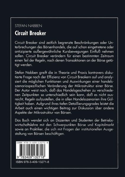 Circuit Breaker sind zeitlich begrenzte Beschränkungen oder Unterbrechungen des Börsenhandels, die auf schon eingetretene oder anzipierte außergewöhnliche Kursbewegungen Einfluß nehmen sollen. Circuit Breaker verändern für einen bestimmten Zeitraum einen Teil der Regeln, nach denen Transaktionen an der Börse getätigt werden. Stefan Nabben greift die in Theorie und Praxis kontrovers diskutierte Frage nach der Effizienz von Circuit Breakern auf und analysiert die möglichen Funktionen und Auswirkungen einer handelsszenariospe zifische Veränderung der Mikrostruktur einer Börse. Der Autor weist nach, daß das Handelsgeschehen zu verschiedenen Zeitpunkten so unterschiedlich sein kann, daß es nicht ausreicht, Regeln aufzustellen, die in allen Handelssze narien ihre Gültigkeiten haben. Verzeichnis: Untersuchung der Frage nach der Effizienz von Circuit Breakern und Analyse der möglichen Funktionen und Auswirkungen einer handelsszenariospezifischen Veränderung der Mikrostruktur einer Börse.