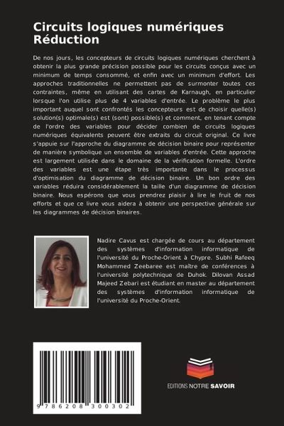De nos jours, les concepteurs de circuits logiques numériques cherchent à obtenir la plus grande précision possible pour les circuits conçus avec un minimum de temps consommé, et enfin avec un minimum d'effort. Les approches traditionnelles ne permettent pas de surmonter toutes ces contraintes, même en utilisant des cartes de Karnaugh, en particulier lorsque l'on utilise plus de 4 variables d'entrée. Le problème le plus important auquel sont confrontés les concepteurs est de choisir quelle(s) solution(s) optimale(s) est (sont) possible(s) et comment, en tenant compte de l'ordre des variables pour décider combien de circuits logiques numériques équivalents peuvent être extraits du circuit original. Ce livre s'appuie sur l'approche du diagramme de décision binaire pour représenter de manière symbolique un ensemble de variables d'entrée. Cette approche est largement utilisée dans le domaine de la vérification formelle. L'ordre des variables est une étape très importante dans le processus d'optimisation du diagramme de décision binaire. Un bon ordre des variables réduira considérablement la taille d'un diagramme de décision binaire. Nous espérons que vous prendrez plaisir à lire le fruit de nos efforts et que ce livre vous aidera à obtenir une perspective générale sur les diagrammes de décision binaires.