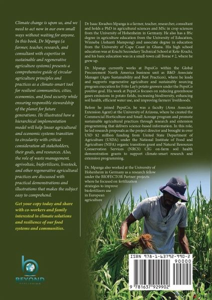 Climate change is upon us, and we need to act now in our own small ways without waiting for anyone. In this book, Dr Mpanga (a farmer, teacher, research, and consultant with expertise in sustainable and regenerative agriculture systems) presents a comprehensive guide of circular agriculture principles and practices as a climate-smart tool for resilient communities, cities, economies, and food security while ensuring responsible stewardship of the planet for future generations. He illustrated how a hierarchical implementation model will help linear agricultural and economic systems transition to circularity with critical consideration all stakeholders, their goals, and resources. Also, the role of waste management, agrivoltaic, biofertilizers, livestock, and other regenerative agricultural practices are discussed with practical demonstrations and illustrations that makes the subject easy to comprehend. Get your copy today and share with co-workers and family interested in climate solutions and resilience of our food systems and communities.