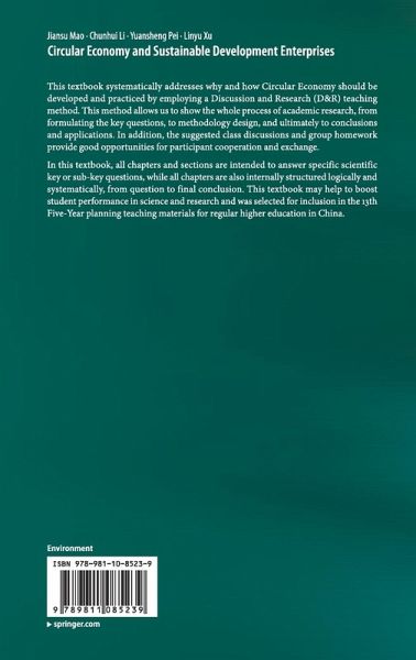 This textbook systematically addresses why and how Circular Economy should be developed and practiced by employing a Discussion and Research (D&R) teaching method. This method allows us to show the whole process of academic research, from formulating the key questions, to methodology design, and ultimately to conclusions and applications. In addition, the suggested class discussions and group homework provide good opportunities for participant cooperation and exchange.