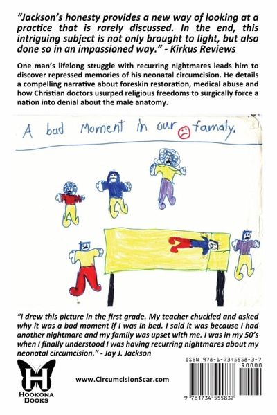 Circumcision Scar is one of the most controversial books ever written. Did you know amputated foreskins are sold to cosmetic companies for $100,000, or that circumcision was alleged to cure brain tumors? It also has a history of megalomania - doctors believed it would cure black men of their predisposition to be rapists, and the more children they circumcised, the higher they'd ascend to god. Most parents circumcise their sons without giving it a second thought. They have no clue what the risks are because doctors never offer "informed consent" - the legal obligation to educate patients on the risks and alleged benefits of any procedure so they understand what's being asked of them. Circumcision facts doctors never tell parents: ¿ Circumcision can permanently change your son's temperament. ¿ Circumcision reduces penis sensitivity and causes erectile dysfunction. ¿ Circumcision can result in amputation, disfigurement, or death. ¿ Your newborn son will be given an erection to facilitate the procedure. ¿ Circumcision has no genuine health benefits. ¿ America has one of the highest HIV rates in the world despite circumcision. Read Jay J. Jackson's blistering exposé into history's most loathed body part. Jay J. Jackson's lifelong struggle with recurring nightmares led him to discover repressed memories of his neonatal circumcision. He details a compelling narrative about foreskin restoration, medical abuse and how Christian doctors surgically forced a nation into denial about the male anatomy. After suffering an unrelated trauma at the age of 1, Jay experienced parallel memories that caused him to discern he'd been in two separate hospital settings as an infant, and his inability to reconcile these conflicting memories became the impetus behind his lifelong struggle. As an adult, Jay sought treatment for erectile dysfunction only to be chased out of multiple doctor's offices that branded him immoral and perverse for suggesting circumcision is harmful. Abandoned by traditional medicine, Jay ultimately found a cosmetic surgeon willing to help and he endured 2 experimental surgeries to reverse the damage his circumcision caused. In his 50's, Jay suddenly realized his recurring nightmares were repressed memories of his neonatal circumcision, which became the impetus for writing this book. He offers an unflinching glimpse into the debilitating mindset of circumcision related sexual trauma - the same debilitating mindset experienced by all victims of sexual violence. He details personal experiences, medical abuse, and the shocking history behind how circumcision became commonplace in America. Circumcision Scar is an emotionally powerful story - after reading this book, never again can it be said that circumcision is harmless. Educate yourself before needlessly circumcising your son. Contents: i) Preface 1) Introduction 2) How will your son learn he's been circumcised? 3) Early Restoration Techniques 4) Attack of the Urologists 5) Foreskin Restoration Surgery 6) Embracing Denial 7) Circumcising Our Imaginary Baby 8) The Final Stretch 9) Faux Foreskin 10) The Prepuce Police 11) How I Remembered My Neonatal Circumcision 12) An Apatheist in a Dogmatic World 13) Cult or Culture? 14) Christian American Doctors Hijack Circumcision 15) Foreskin Fascist 16) The Church of Medicine 17) Side Effects May Include 18) Modern Intactivism 19) CODA: My Foreskin My Choice (audiobook only) - Notes