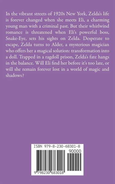 In the vibrant streets of 1920s New York, Zelda's life is forever changed when she meets Eli, a charming young man with a criminal past. But their whirlwind romance is threatened when Eli's powerful boss, Snake-Eye, sets his sights on Zelda. Desperate to escape, Zelda turns to Alder, a mysterious magician who offers her a magical solution: transformation into a doll. Trapped in a ragdoll prison, Zelda's fate hangs in the balance. Will Eli find her before it's too late, or will she remain forever lost in a world of magic and shadows?