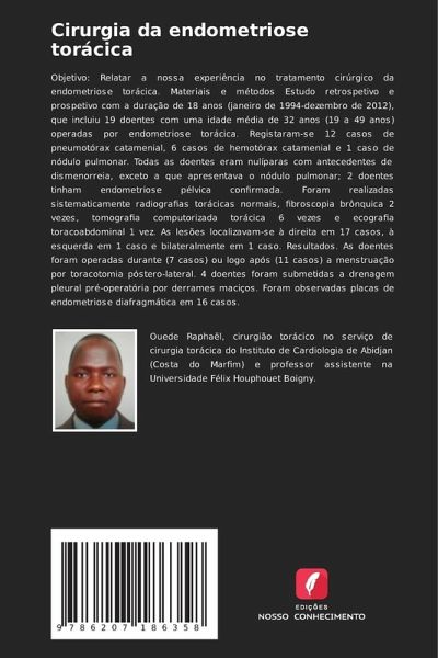 Objetivo: Relatar a nossa experiência no tratamento cirúrgico da endometriose torácica. Materiais e métodos Estudo retrospetivo e prospetivo com a duração de 18 anos (janeiro de 1994-dezembro de 2012), que incluiu 19 doentes com uma idade média de 32 anos (19 a 49 anos) operadas por endometriose torácica. Registaram-se 12 casos de pneumotórax catamenial, 6 casos de hemotórax catamenial e 1 caso de nódulo pulmonar. Todas as doentes eram nulíparas com antecedentes de dismenorreia, exceto a que apresentava o nódulo pulmonar; 2 doentes tinham endometriose pélvica confirmada. Foram realizadas sistematicamente radiografias torácicas normais, fibroscopia brônquica 2 vezes, tomografia computorizada torácica 6 vezes e ecografia toracoabdominal 1 vez. As lesões localizavam-se à direita em 17 casos, à esquerda em 1 caso e bilateralmente em 1 caso. Resultados. As doentes foram operadas durante (7 casos) ou logo após (11 casos) a menstruação por toracotomia póstero-lateral. 4 doentes foram submetidas a drenagem pleural pré-operatória por derrames maciços. Foram observadas placas de endometriose diafragmática em 16 casos.