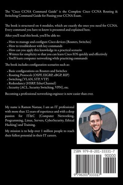 The "Cisco CCNA Command Guide" is the Complete Cisco CCNA Routing & Switching Command Guide for Passing your CCNA Exam. A guide that will cover everything in Cisco Routing and Switching Command, including Subnetting, VLSM, and Supernetting. You will be able to pass your CCNA (Cisco Certified Networking Associate) exam and become a Cisco technology specialist sooner than you expected. The book is structured on 4 modules, which are exactly the ones you need for CCNA. Every command you have to know is presented and explained here. After you'll read this book, you'll be able to:How to manage and configure Cisco devices (Routers, Switches) How to troubleshoot with key commands How can you apply this knowledge in a practical scenario Written for simplicity so that you can learn Cisco IOS quickly and effectively You'll learn computer networking while practicing commands The book includes configuration scenarios such as:Basic configurations on Routers and Switches Routing Protocols (OSPF, EIGRP, eBGP, RIP) Switching (VLAN, STP, VTP) Redundancy (HSRP, EtherChannel) Security (ACL, Security Switching, VPN), etc. Becoming a professional networking engineer is now easier than ever. By getting this book today, you'll shortly see that Cisco Routing and Command are something anyone can understand with a little bit of practice.
