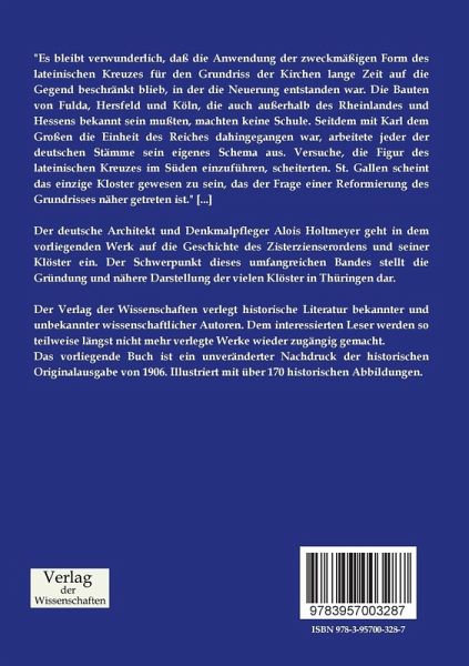 Der deutsche Architekt und Denkmalpfleger Alois Holtmeyer geht in dem vorliegenden Werk auf die Geschichte des Zisterzienserordens und seiner Klöster ein. Der Schwerpunkt dieses umfangreichen Bandes stellt die Gründung und nähere Darstellung der vielen Klöster in Thüringen dar.