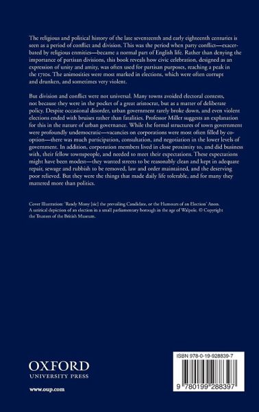 The religious and political history of late seventeenth- and early eighteenth-century England is typically written in terms of conflict and division. This was the period when party conflict - exacerbated by religious enmities - became a normal part of English life. Rather than denying the importance of partisan divisions, this book reveals how civic celebration, designed as an expression of unity and amity, was often used for partisan purposes, reaching a peak in the 1710s. The animosities were most marked in elections, which were often corrupt and drunken, and sometimes very violent. But division and conflict were not universal. Many towns avoided electoral contests, not because they were in the pocket of a great aristocrat, but as a matter of deliberate policy. Despite occasional disorder, urban government rarely broke down, and even violent elections ended with bruises rather than fatalities. Professor Miller suggests an explanation for this in the nature of urban governance. While the formal structures of town government were profoundly undemocratic - vacancies on corporations were most often filled by co-option - there was much participation, consultation, and negotiation in the lower levels of government. In addition, corporation members lived in close proximity to, and did business with, their fellow townspeople, and needed to meet their expectations. These expectations might have been modest - they wanted streets to be reasonably clean and kept in adequate repair, sewage and rubbish to be removed, law and order maintained, and the deserving poor relieved. But they were the things that made daily life tolerable, and for many they mattered more than politics.