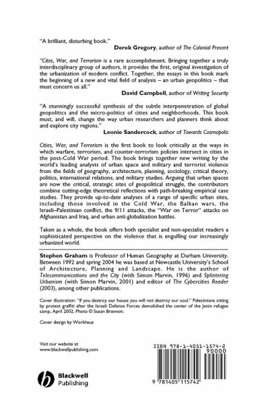 "Acts of war and terror against cities and their inhabitants(both anti-state and state sanctioned) are saturating ourcontemporary world. Yet urban researchers are in denial of thisstarkest of contemporary urban realities. Graham brings togetherthe renegade thinkers and researchers who are tracking the ways inwhich global geopolitics is imploding into the urban world. Cities,War and Terrorism is a stunningly successful synthesis of thesubtle interpenetration of global geopolitics and themicro-politics of cities and neighborhoods. It marks the beginningof a new and crucial research domain: that of urban geopolitics.This book must, and will, change the way urban researchers andplanners think about and explore city regions. It helps to makesense of the ways in which the historic functions of cities andnation states (social welfare, education, health, planning) arebeing overwhelmed by the imperative of 'security' and the politicsof fear. Purposely provocative and deeply disturbing." LeonieSandercock, University of British Columbia