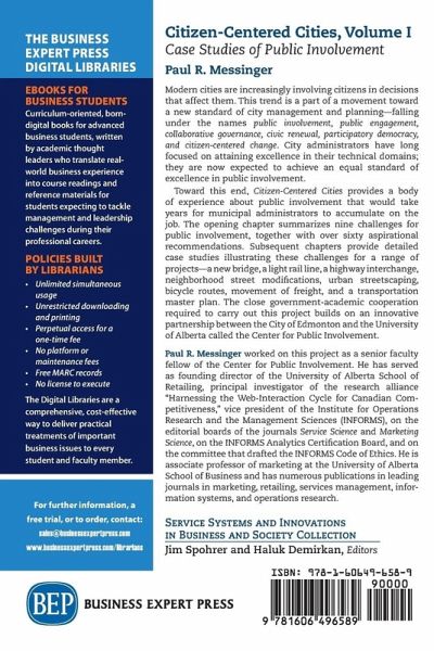 Modern cities are increasingly involving citizens in decisions that affect them. This trend is a part of a movement toward a new standard of city management and planning-falling under the names public involvement, public engagement, collaborative governance, civic renewal, participatory democracy, and citizen-centered change. City administrators have long focused on attaining excellence in their technical domains; they are now expected to achieve an equal standard of excellence in public involvement. Toward this end, Citizen-Centered Cities provides a body of experience about public involvement that would take years for municipal administrators to accumulate on the job. The opening chapter summarizes nine challenges for public involvement, together with over sixty aspirational recommendations. Subsequent chapters provide detailed case studies illustrating these challenges for a range of projects-a new bridge, a light rail line, a highway interchange, neighborhood street modifications, urban streetscaping, bicycle routes, movement of freight, and a transportation master plan. The close government-academic cooperation required to carry out this project builds on an innovative partnership between the City of Edmonton and the University of Alberta called the Center for Public Involvement.