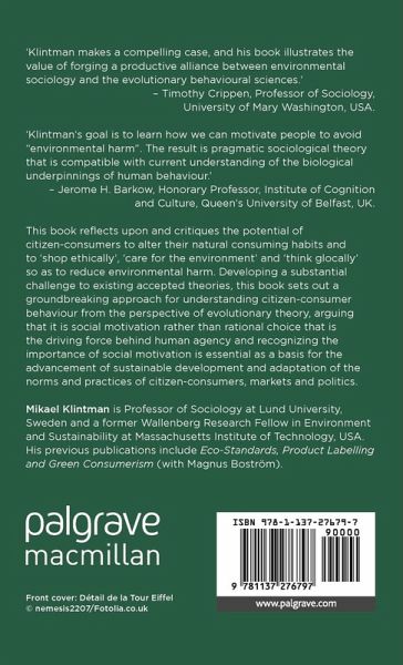 'Klintman's goal is to learn how we can motivate people to avoid "environmental harm". He discards the boundary-maintaining fixed beliefs that have put sociology at risk of being left on the side of the road. The result is pragmatic sociological theory that is compatible with current understanding of the biological underpinnings of human behavior.' - Jerome H. Barkow, Honorary Professor, Institute of Cognition and Culture, Queen's University of Belfast, UK and Professor Emeritus of Social Anthropology, Dalhousie University, Halifax, Canada