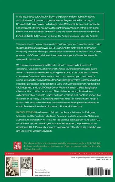 This open access book presents an international history of humanitarianism during the Bangladesh Liberation War in 1971. Examining the motivations, actions and competing interests of multiple humanitarian actors such as the Red Cross, Oxfam, grassroots NGOs and individuals, it analyses the impact of humanitarianism for refugees in the camps. With western governments indifferent or slow to respond to India's pleas to assistance, Stevens shows how international aid to Bangladeshi refugees during the 1971 crisis was citizen-driven. Focusing on the actions of individuals and NGOs in Australia, Stevens shows how they rallied community support, fundraised at record levels and effectively lobbied the Australian government to increase aid and recognise Bangladesh's independence. Using archival materials from Australia, the UK, Switzerland and the US, Citizen-driven Humanitarianism and the Bangladeshi Liberation War provides an account of how civil society was galvanized, even radicalized, in their pursuit to remedy systemic problems such as ethnic persecution, militarism and poverty. Documenting the myriad forces at play during the refugee crisis of 1971, it shows how broader social and cultural developments coalesced to create the citizen-driven humanitarianism of the late 20th century. The ebook editions of this book are available open access under a CC BY-NC-ND 4.0 licence on bloomsburycollections.com. Open access was funded by Australian Catholic University.