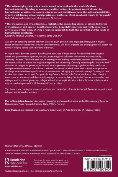 In recent years, Europe's borders have become new sites of intervention for traditional humanitarian actors and governmental agencies, but also, increasingly, for volunteer and activist initiatives led by "ordinary" citizens. This book sets out to interrogate the shifting relationship between humanitarianism, the securitization of border and migration regimes, and citizenship. Critically examining the "do it yourself" character of refugee aid practices performed by non-professionals coming together to help in informal and spontaneous manners, the volume considers the extent to which these new humanitarian practices challenge established conceptualisations of membership, belonging, and active citizenship. Drawing on case studies from countries around Europe including Greece, Turkey, Italy, France and Russia, this collection constitutes an innovative and theoretically engaged attempt to bring the field of humanitarian studies into dialogue with studies of grassroots refugee aid and, more explicitly, with political forms of solidarity with migrants and refugees which fall between aid and activism.