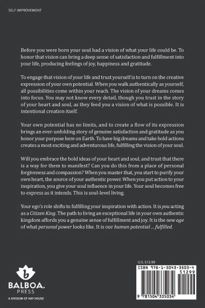 Before you were born your soul had a vision of what your life could be. To honor that vision can bring a deep sense of satisfaction and fulfillment into your life, producing feelings of joy, happiness and gratitude. To engage that vision of your life and trust yourself is to turn on the creative expression of your own potential. When you walk authentically as yourself, all possibilities come within your reach. The vision of your dreams comes into focus. You may not know every detail, though you trust in the story of your heart and soul, as they feed you a vision of what is possible. It is intentional creation itself. Your own potential has no limits, and to create a flow of its expression brings an ever-unfolding story of genuine satisfaction and gratitude as you honor your purpose here on Earth. To have big dreams and take bold actions creates a most exciting and adventurous life, fulfilling the vision of your soul. Will you embrace the bold ideas of your heart and soul, and trust that there is a way for them to manifest? Can you do this from a place of personal forgiveness and compassion? When you master that, you start to purify your own heart, the source of your authentic power. When you put action to your inspiration, you give your soul influence in your life. Your soul becomes free to express as it intends. This is soul-level living. Your ego's role shifts to fulfilling your inspiration with action. It is you acting as a Citizen King. The path to living an exceptional life in your own authentic kingdom affords you a genuine sense of fulfillment and joy. It is the new age of what personal power looks like. It is our human potential ... fulfilled.