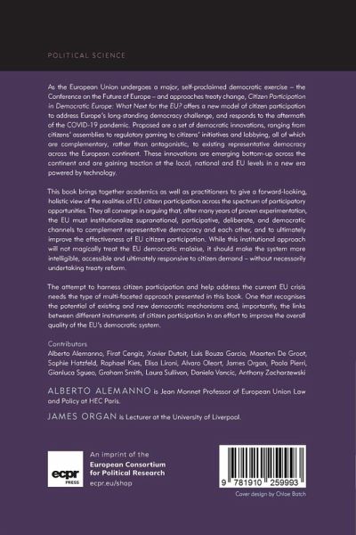 As the European Union undergoes a major, self-proclaimed democratic exercise the Conference on the Future of Europe and approaches Treaty change, this volume offers a new model of citizen participation to address Europe's long-standing democracy challenge, and respond to the aftermath of the COVID-19 pandemic. Proposed are a set of democratic innovations, ranging from citizens assemblies to regulatory gaming to citizens initiatives and lobbying, which are complementary, not antagonistic, to existing representative democracy across the European continent. These innovations are emerging bottom-up across the continent and getting traction at local, national and EU level in a new era powered by technology. This book brings together academics as well as practitioners to give a forward-looking, holistic view of the realities of EU citizen participation across the spectrum of participatory opportunities. They all converge in arguing that, after many years of proven experimentation, the EU must institutionalize supranational, participative and deliberative, democratic channels to complement representative democracy and each other, and ultimately improve the effectiveness of EU citizen participation. While this institutional approach will not magically treat the EU democratic malaise, it should make the system more intelligible, accessible, and ultimately responsive to citizen demand without necessarily undertaking Treaty reform. The attempt to harness citizen participation to help address the current EU crisis needs the type of multi-faceted approach presented in this book. One that recognises the potential of existing and new democratic mechanisms, and also, importantly, the links between different instruments of citizen participation to improve the overall quality of EU's democratic system