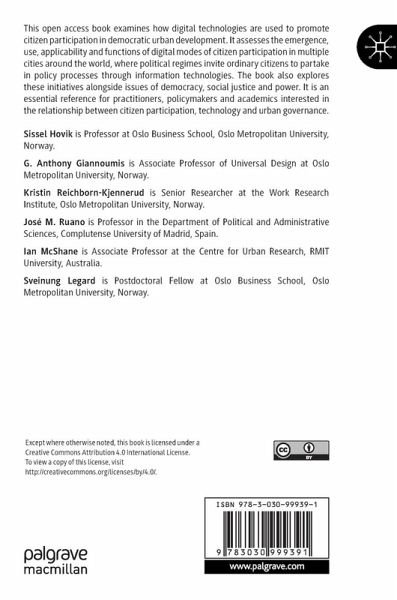 Chapter 1: Introduction.- Part 1: Digital Participation, Public Administration, and Community Engagement.- Chapter 2: Digital Participation and Influence.- Chapter 3: Exploring the Nexus of Non-Partisanship in Public Administration and Community Engagement in Oslo, Melbourne and Madrid.- Chapter 4: Going Digital or Staying Analogue?.- Chapter 5: E-Gentrification and the Right to the City.- Part 2: Case Studies of E-Governance and E-Participation in Urban Development.- Chapter 6: Social Media: A Driver for Democratization of Urban Planning and Policy Making?.- Chapter 7: E-Governance, Universal Design and the Political Participation of Disadvantaged Groups.- Chapter 8: Barriers, Disability and Online Public Engagement Platforms in Ukraine.- Chapter 9: Impact of Participatory Innovations.