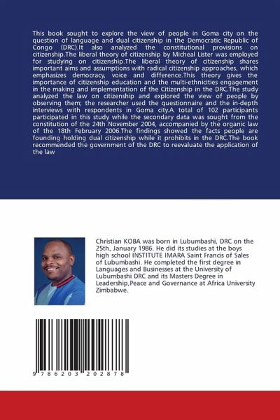 This book sought to explore the view of people in Goma city on the question of language and dual citizenship in the Democratic Republic of Congo (DRC).It also analyzed the constitutional provisions on citizenship.The liberal theory of citizenship by Micheal Lister was employed for studying on citizenship.The liberal theory of citizenship shares important aims and assumptions with radical citizenship approaches, which emphasizes democracy, voice and difference.This theory gives the importance of citizenship education and the multi-ethnicities engagement in the making and implementation of the Citizenship in the DRC.The study analyzed the law on citizenship and explored the view of people by observing them; the researcher used the questionnaire and the in-depth interviews with respondents in Goma city.A total of 102 participants participated in this study while the secondary data was sought from the constitution of the 24th November 2004, accompanied by the organic law of the 18th February 2006.The findings showed the facts people are founding holding dual citizenship while it prohibits in the DRC.The book recommended the government of the DRC to reevaluate the application of the law