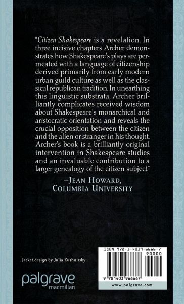 Shakespeare was not a citizen of London. But the language of his plays is shot through with the concerns of London 'freemen' and their wives, the diverse commercial class that nevertheless excluded adult immigrants from country towns and northern Europe alike. This book combines London historiography, close reading, and recent theories of citizen subjectivity to demonstrate for the first time that Shakespeare's plays embody citizen and alien identities despite their aristocratic settings. Through three chapters, the book points out where the city shadows the country scenes of the major comedies, shows how London's trades animate the 'civil butchery' of the history plays, ans explains why England's metropolis becomes the fractured Rome of tragedy,