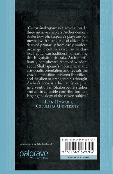 Shakespeare was not a citizen of London. But the language of his plays is shot through with the concerns of London 'freemen' and their wives, the diverse commercial class that nevertheless excluded adult immigrants from country towns and northern Europe alike. This book combines London historiography, close reading, and recent theories of citizen subjectivity to demonstrate for the first time that Shakespeare's plays embody citizen and alien identities despite their aristocratic settings. Through three chapters, the book points out where the city shadows the country scenes of the major comedies, shows how London's trades animate the 'civil butchery' of the history plays, ans explains why England's metropolis becomes the fractured Rome of tragedy,