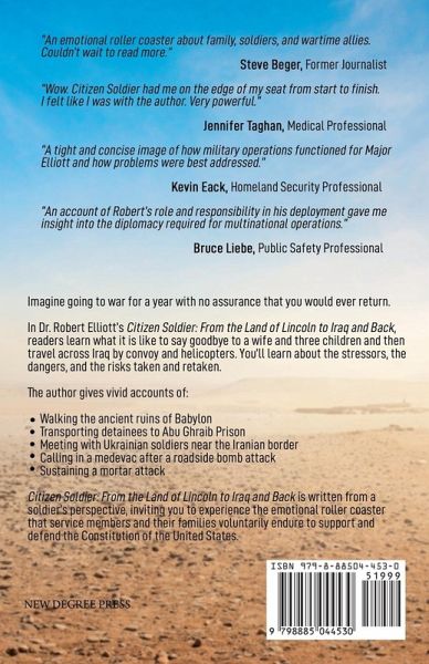 Imagine going to war for a year with no assurance that you would ever return. In Dr. Robert Elliott's Citizen Soldier: From the Land of Lincoln to Iraq and Back, readers learn what it is like to say goodbye to a wife and three children and then travel across Iraq by convoy and helicopters. You'll learn about the stressors, the dangers, and the risks taken and retaken. The author gives vivid accounts of: Walking the ancient ruins of Babylon Transporting detainees to Abu Ghraib Prison Meeting with Ukrainian soldiers near the Iranian border Calling in a medevac after a roadside bomb attack Sustaining a mortar attack Citizen Soldier: From the Land of Lincoln to Iraq and Back is written from a soldier's perspective, inviting you to experience the emotional roller coaster that service members and their families voluntarily endure to support and defend the Constitution of the United States.