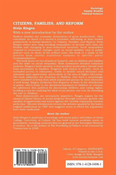 Modern families are economic institutions of great productivity. They contribute as much to a society's economic well-being as does worker productivity in formal markets. In Citizens, Families, and Reform, Stein Ringen shows how long-standing inequalities of income and class are flexible and changing in post-industrial societies. Such inequalities respond to structural changes such as social mobility and to public policies such as those of the welfare state. His book is a study of the process from careful statistical analysis to specific policy recommendations.The book draws on two strands of research, one on children and families and the other on social inequality. Both summarize detailed statistical analysis. Ringen's basic premise is that prudent social policy should start from investment in families. Progress and reform in society, such as extended access to education, tends to modify social divisions and stimulate open opportunity, particularly in the area of higher education. The book addresses the situation of children, who have a surprisingly lower standard of living than adult population groups by most measures of well-being. Ringen attributes this disparity to flaws in the distribution of power, which leads to the disenfranchisement of children as citizens. He addresses this problem by discussing children and voting rights, building a case for realizing the ideal of one person, one vote, by extending the vote to children.Real democracies are necessarily imperfect. Ringen argues for the classical liberal theory of social progress through economic growth and equality of opportunity and warns against the "terrible temptation towards perfection." His new introduction reviews the debates sparked by the book's original publication in 1997 and suggests areas in which his arguments have been vindicated.
